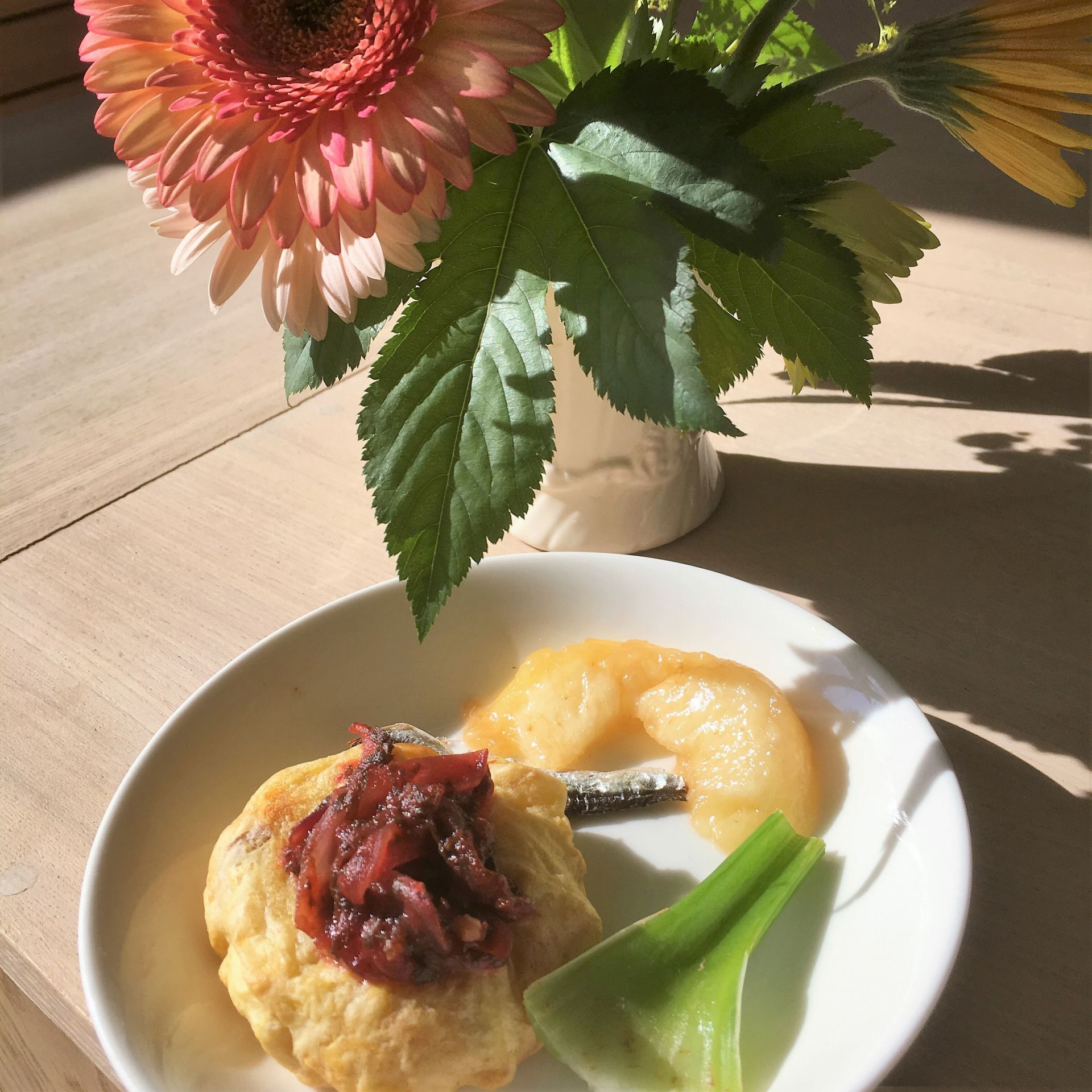 今日のおやつ イタリア風ジャガイモ餅 セロリ 煮干し 桃