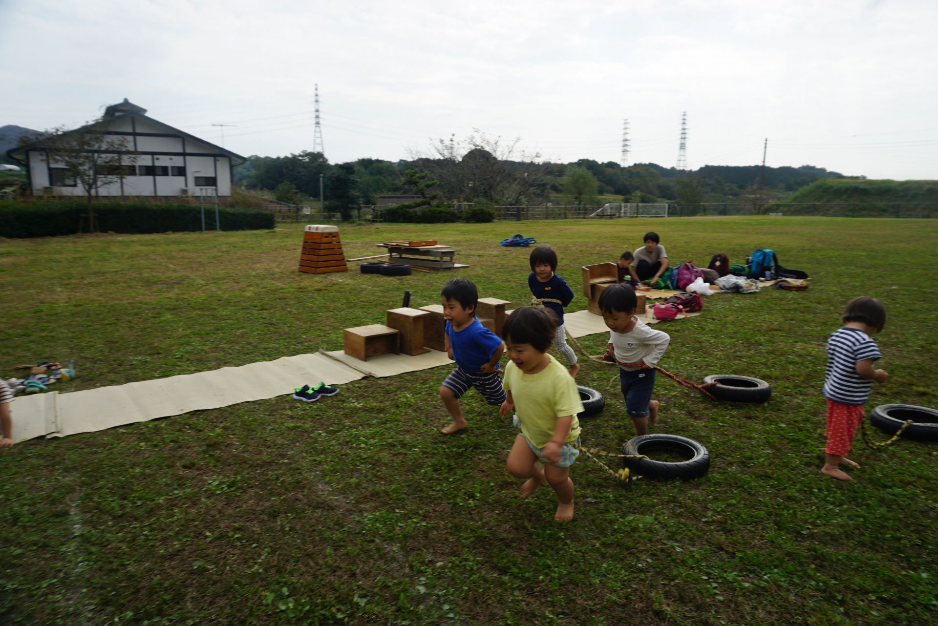毎日保育園の芝生の斜面をタイヤを引いて走り回りました。