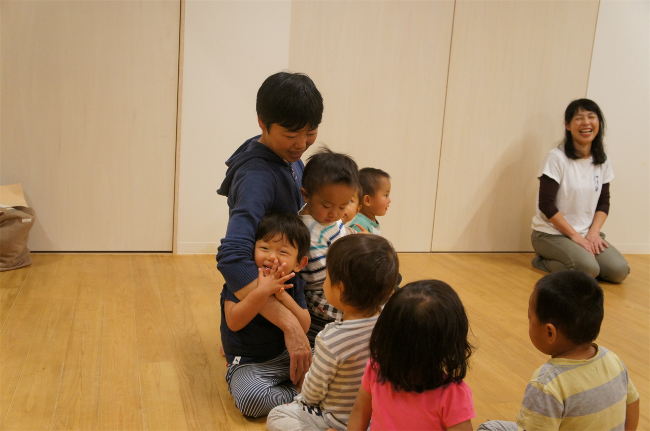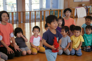 2歳を過ぎた頃、小さな集団ではできるのに、大きな集団になるとモジモジしてしまいできなくなってしまう姿も見られます。