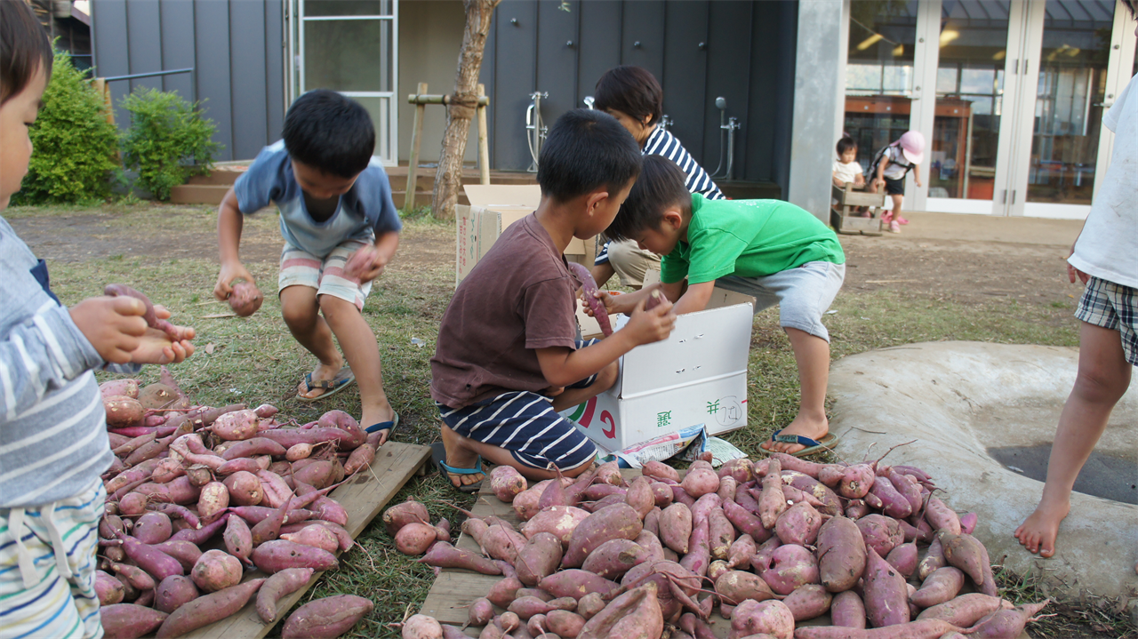 子どもたちはまるで宝探しのように手を使い、シャベルを使いお芋を掘りました。