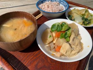 今日のお昼ごはん ごはん さわらの煮つけ 青菜と里芋の梅和え みそ汁