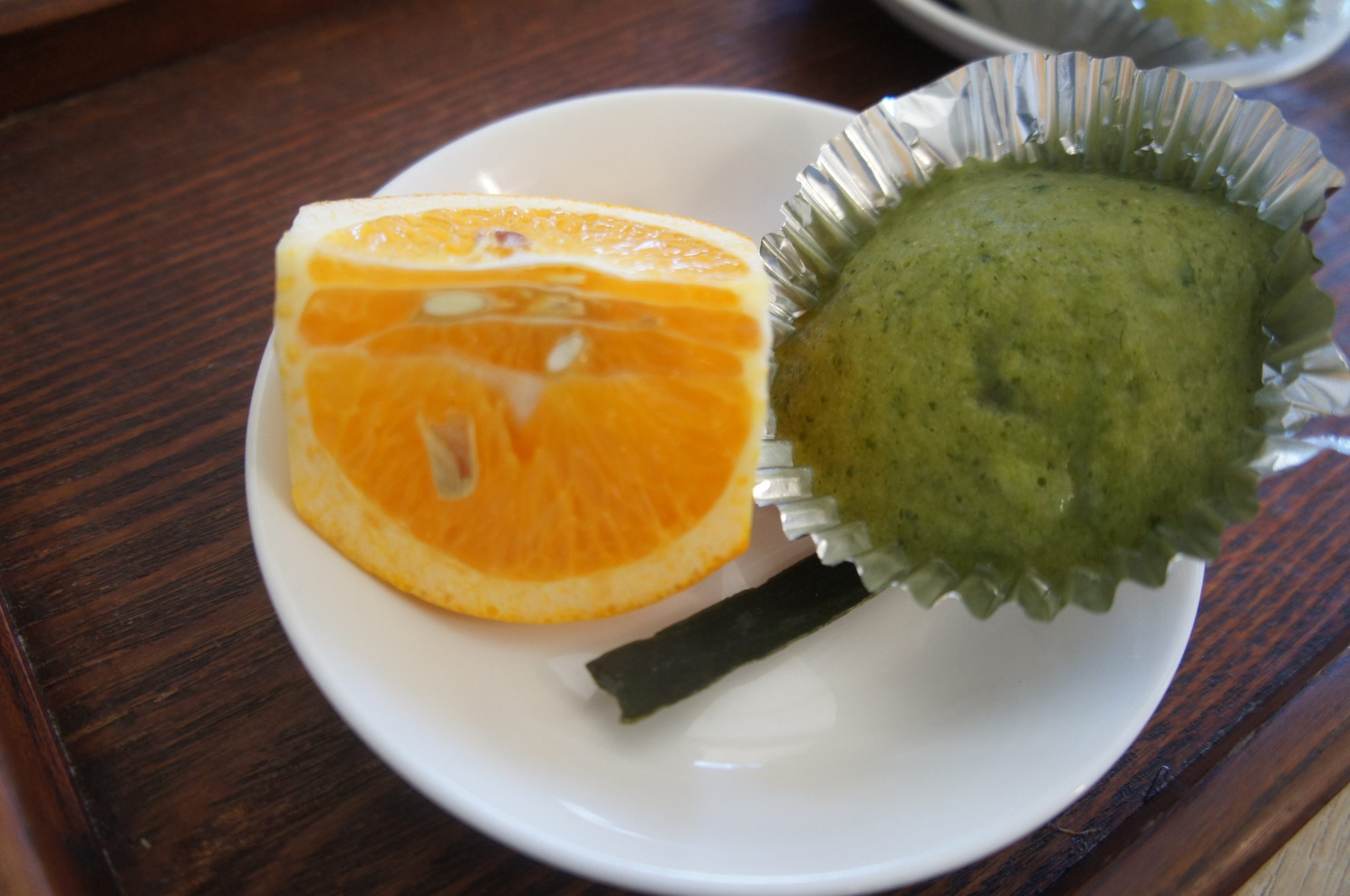 【本日のおやつ】小松菜蒸しパン・季節の果物・昆布