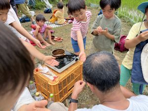 ちゃんと調べればもっといろいろな生きものがいそうですが、それよりも食欲!ということで、みんなでヤゴやバッタ類、ドジョウ、サワガニを採っておいしくいただきました。