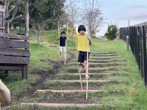 竹馬に乗れるようになるまでに、2日で乗れるの子もいれば2週間かかる子もいます。子どもたちは、「乗れるようになりたい。」という気持ちがあるからこそあきらめません。