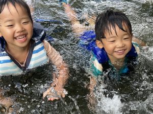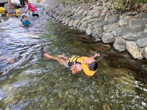 川の流れにドキドキしながら、浮かんでみたり、飛び込んでみたり。
