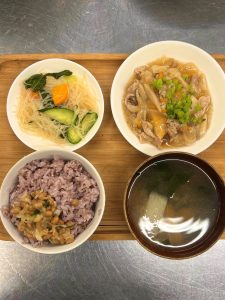 2025.10.17 本日のお昼ご飯とおやつ(10/17) ・御飯+納豆 ・厚揚げの和風あんかけ ・チンゲン菜の春雨サラダ ・みそ汁 【本日のおやつ】★10月たんたんケーキ かぼちゃの焼きプリンに豆腐クリームとブルーベリーをトッピングしました