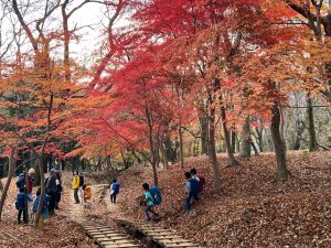 真っ赤な紅葉のトンネル。足元には真っ赤な落ち葉のじゅうたんです。