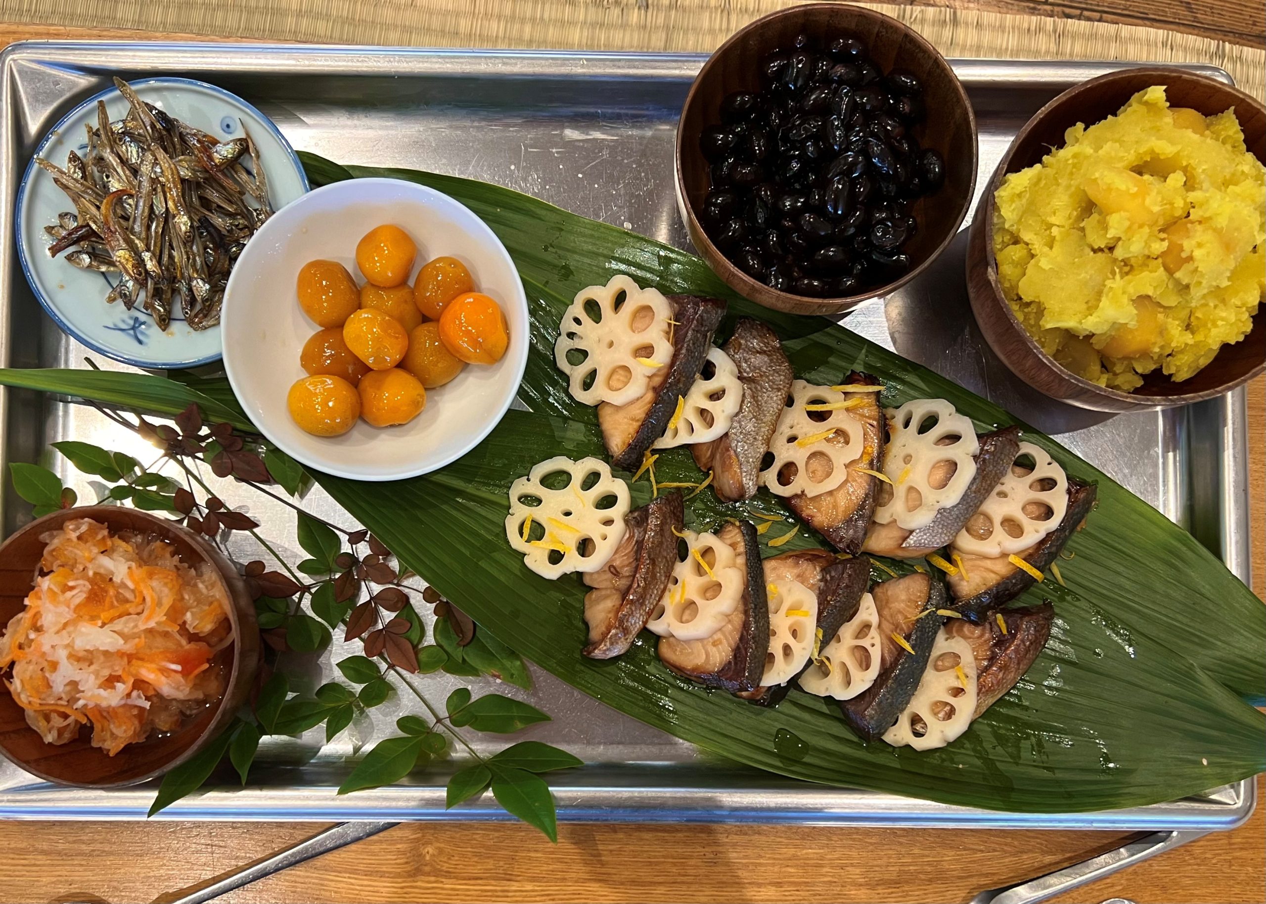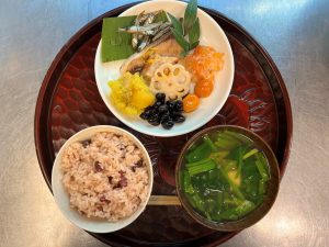 2026.01.09 本日のお昼ご飯とおやつ(1/9) ★お正月会 ・赤飯 ・ぶり照り焼き 飾り蓮根添え ・紅白なます/黒豆/栗きんとん/田作り/きんかん ・すまし汁 【本日のおやつ】焼き芋、みかん、にぼし