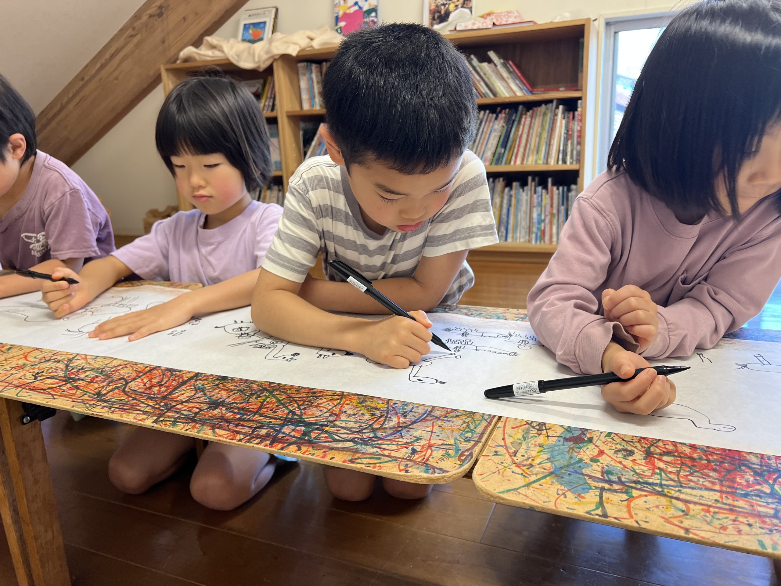 お昼寝後は長い和紙に、みんなで馬の絵を描きます。