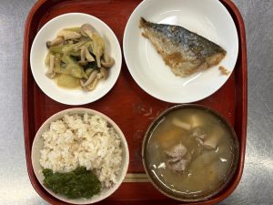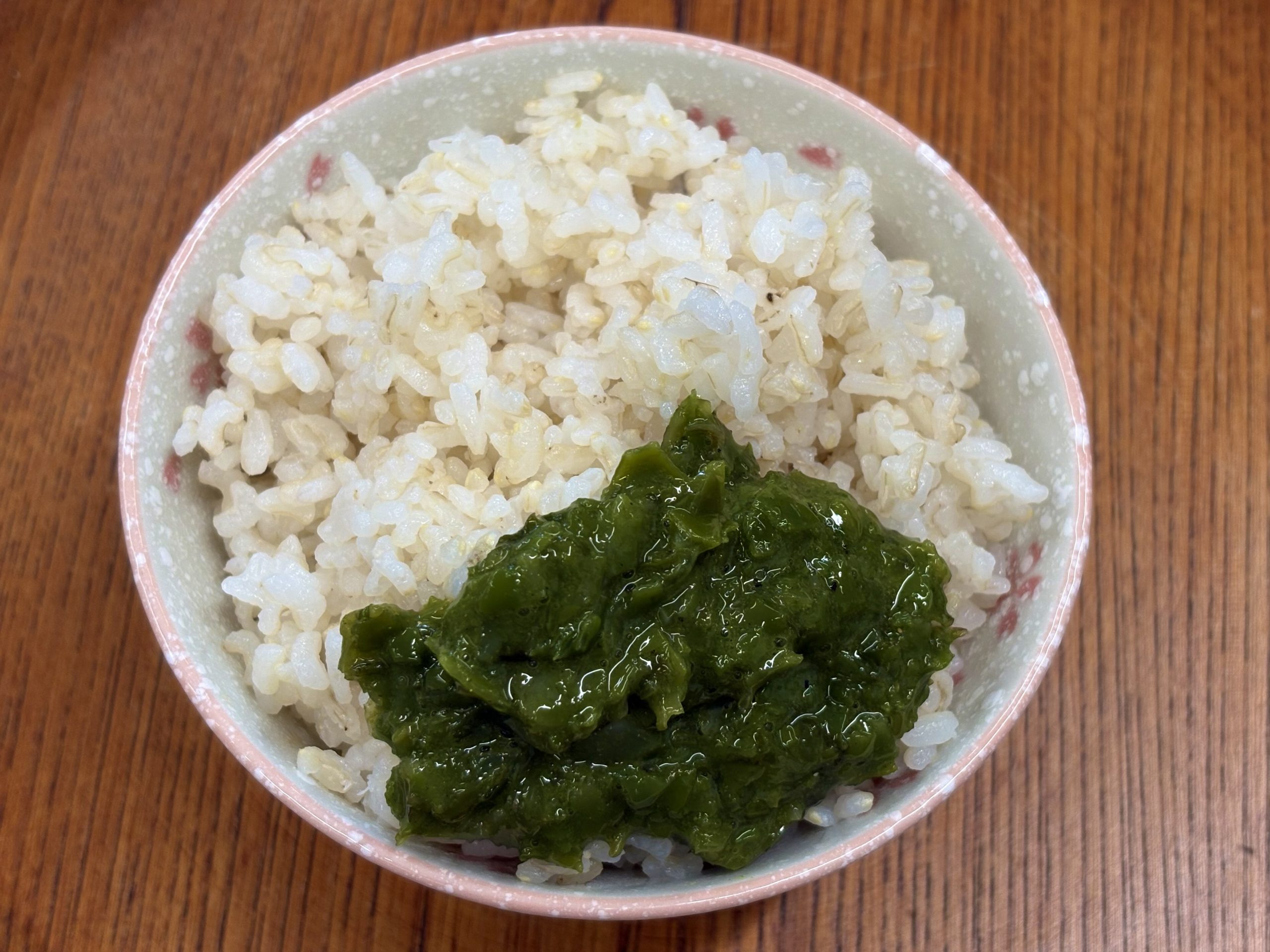 2026.04.20 本日のお昼ご飯とおやつ(4/20) ・御飯+めかぶ ・魚の西京焼き ・小松菜のお浸し ・豚汁 【本日のおやつ】しらす梅おにぎり、ジューシーフルーツ、にぼし ※乳児棟にめかぶの提供はありません