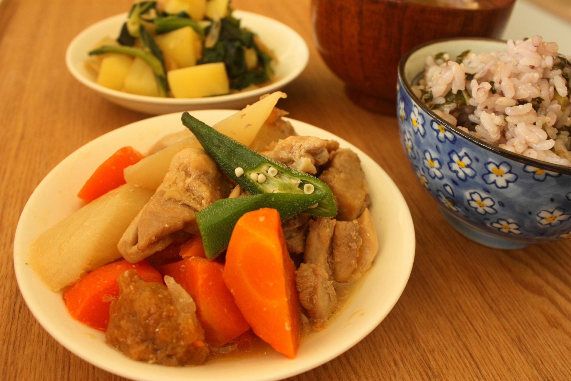 大豆御飯 白菜と豚肉の重ね蒸し シーチキンサラダ わかめスープ おやつひじき芋餅 高野豆腐のだし煮 にぼし ...