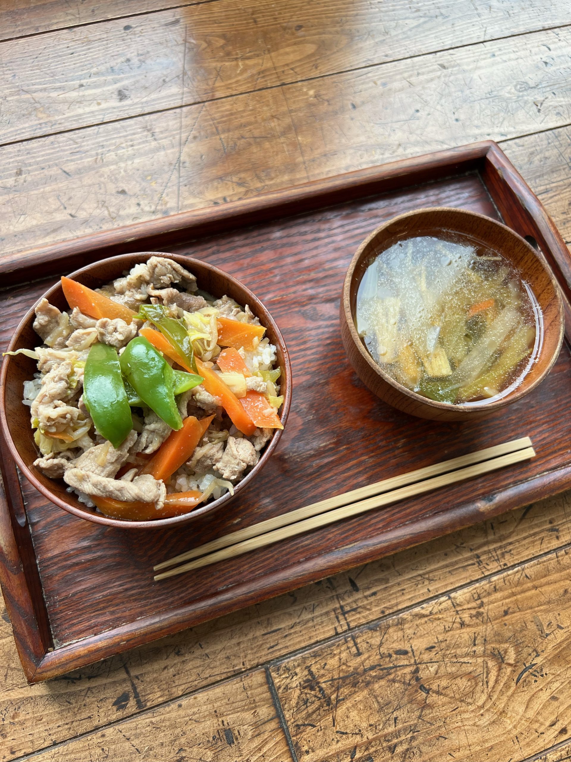 ・豚の生姜焼き丼 ・具沢山汁 【本日のおやつ】 わかめおにぎり、りんご、にぼし ...
